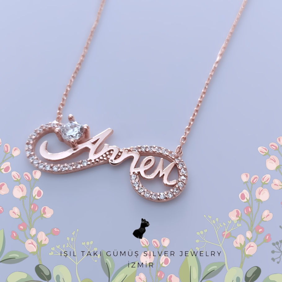 925 ayar gümüş, roz kaplama, zirkon taşlı, 43+5 cm forsa zincir, Annem ve sonsuzluk kolye.