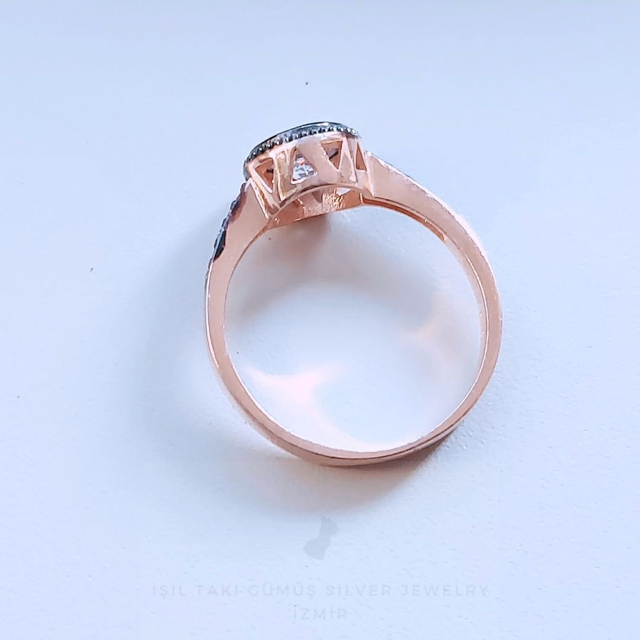 925 Ayar gümüş, roz kaplama, siyah kalemli, zirkon taşlı tektaş yüzük.