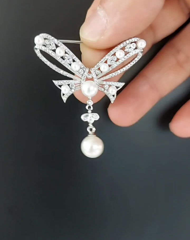 925 ayar gümüş, rodyum kaplama, ithal, inci ve zirkon taşlı, 4.5x4cm broş, inci yaka iğnesi.
