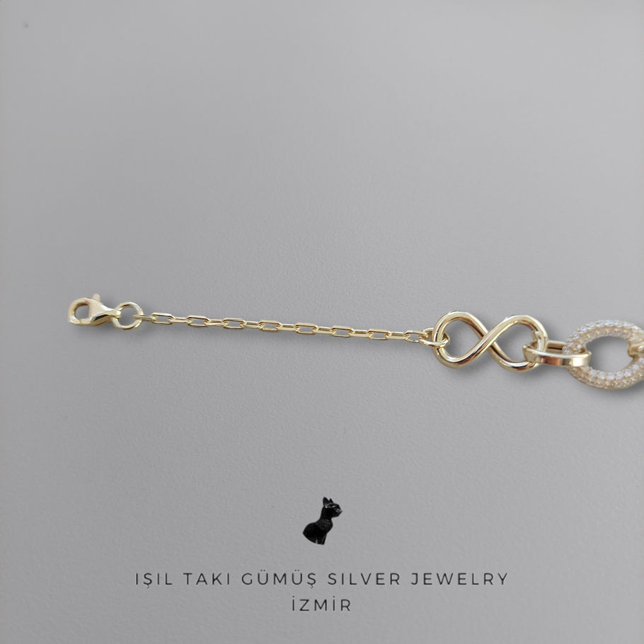 925 ayar gümüş, 14k altın renginde kaplamalı, zirkon taşlı 18 cm, 13mm (orta figur), 8mm (zincir), 1.5mm (zincir) sonsuzluk zincir bileklik.
