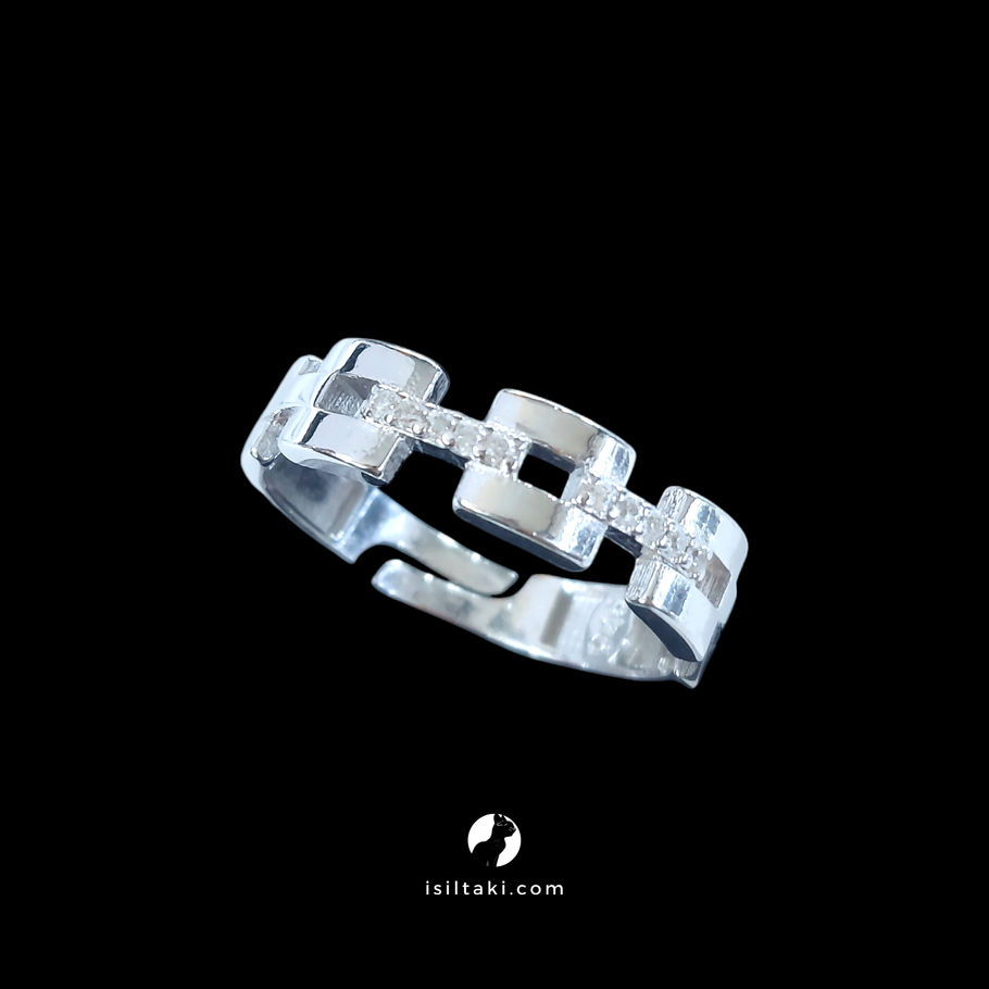 925 ayar gümüş, rodyum kaplama, 5.3mm, zirkon taşlı, alttan açık, link zincir yüzük.