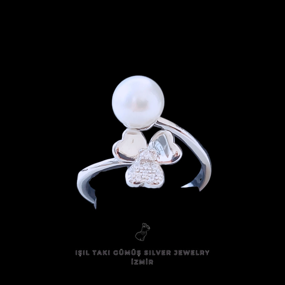 925 ayar gümüş, ithal, rodyum kaplama, zirkon taşlı yonca detaylı minimal Mallorca (kaplama) inci yüzük.