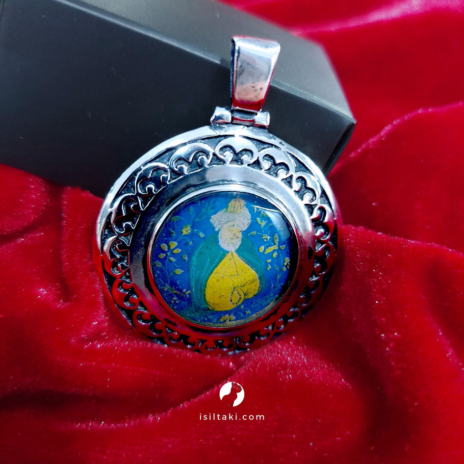 925 ayar gümüş, kolleksiyonluk, çevresi tılsımlı vav, arka yüzü çicek süslemeli, 4.5cm Mevlana Rumi Kolye Ucu.